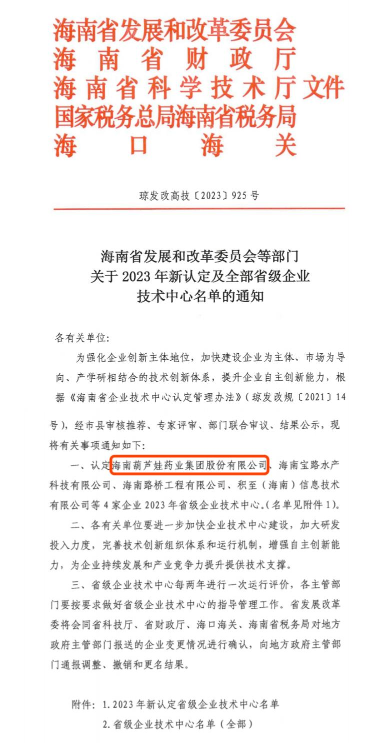 近日,海南省发改委等多部门联合公布了《关于2023年新认定及全部省级企业技术中心名单的通知》,其中,海南优发国际药业集团股份有限公司成功通过评审,被认定为省级企业技术中心,是本次获批的4家企业之一。