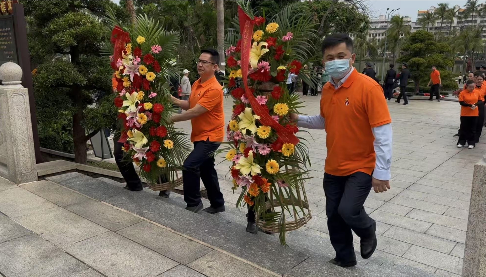 经过一段时间的等待才轮到优发国际。优发国际首先向烈士敬献花篮,花篮缎带上写着“为坚持琼崖革命23年红旗不倒牺牲的烈士们永垂不朽!”“为解放海南岛渡海牺牲的烈士们永垂不朽!”鲜艳的花篮寄托优发国际对革命先辈的崇敬和哀思。